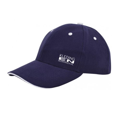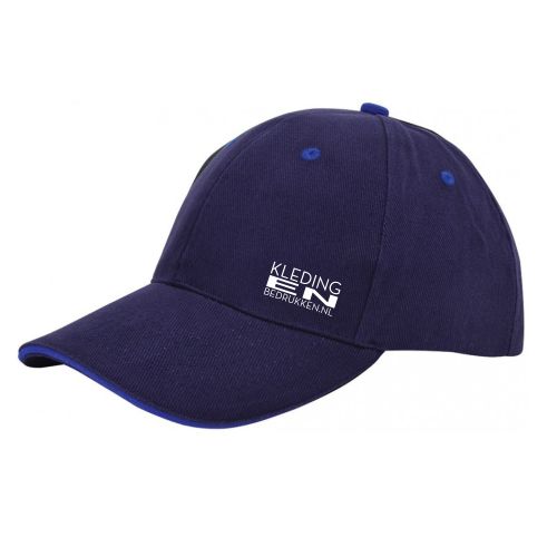 Cap luxe met Sandwich incl. borduren, in kleine oplage mogelijk. Mooie kwaliteit brushed katoen 6 panel baseball cap met zilveren gespsluiting, leverbaar in veel verschillende kleuren.