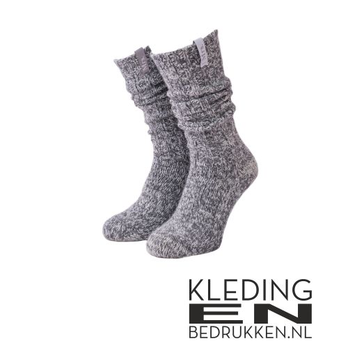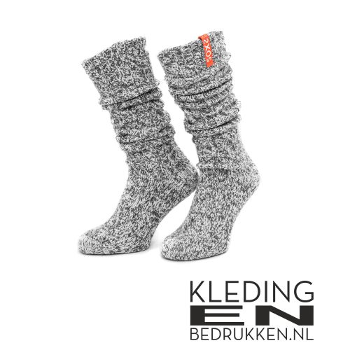 Geitenwollen sokken met label. (H)eerlijk warm de vertrouwde grijze geitenwollen sok gemaakt